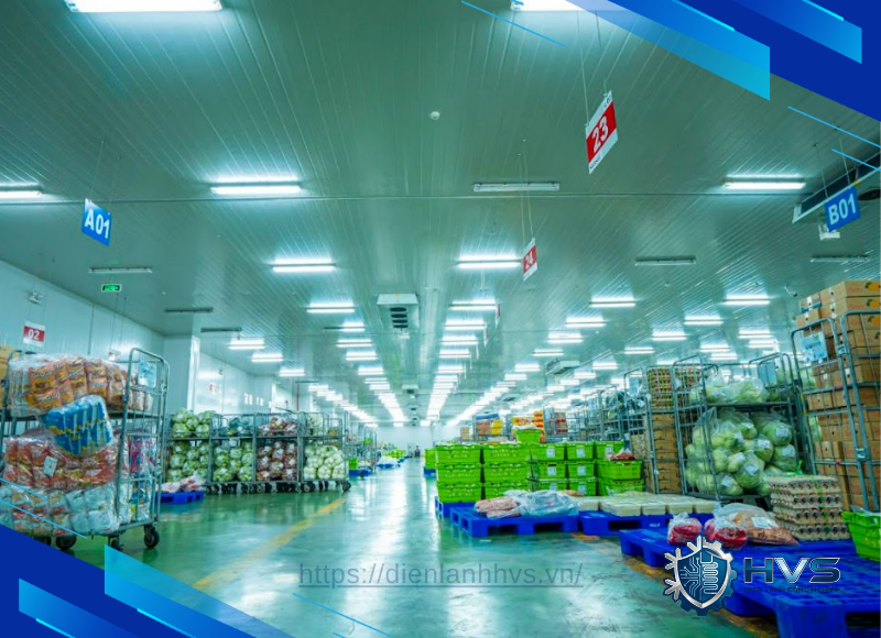 Thay vì nhiều tủ nhỏ manh mún, một kho lạnh HVS có thể bảo quản vài trăm đến hàng chục tấn rau – củ, xếp kệ khoa học, dễ phân loại và xuất hàng.
